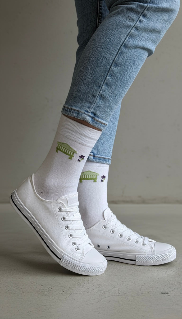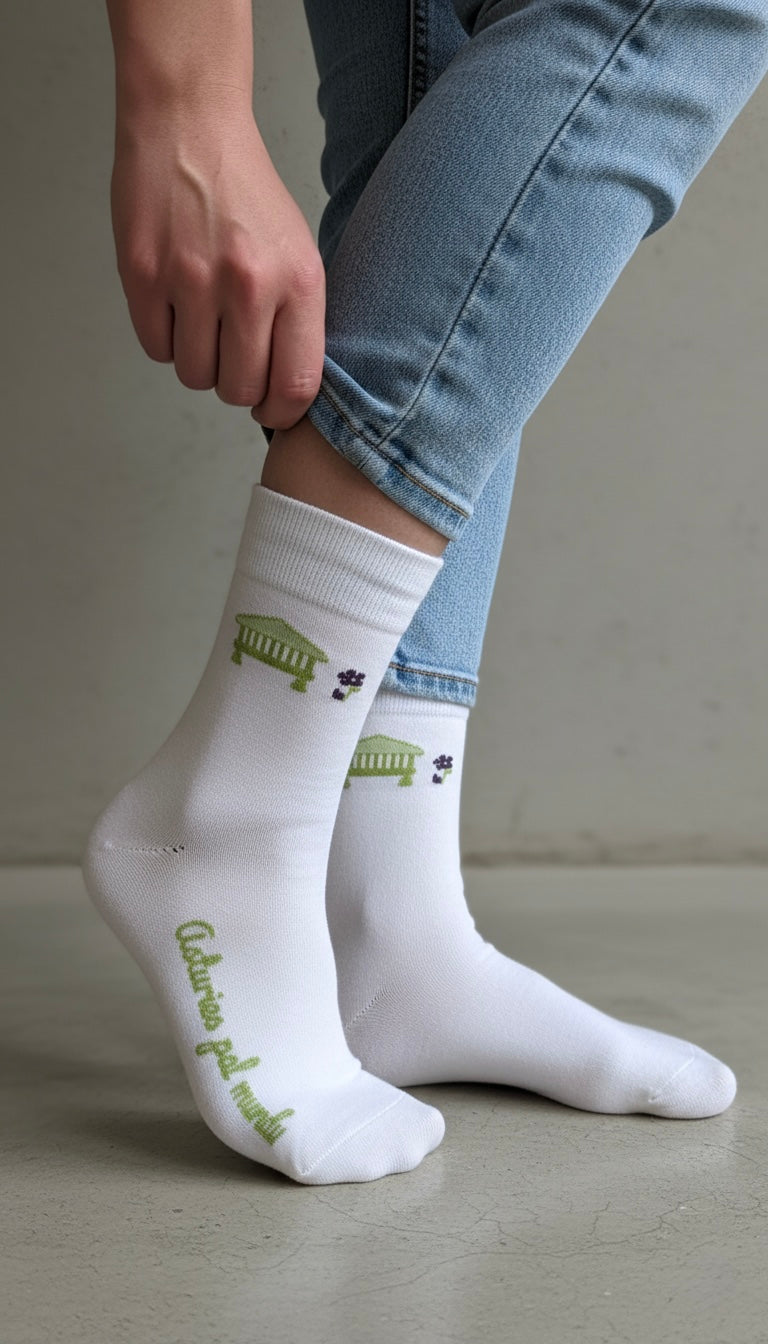 Lleva Asturies a tus pies. Con un diseño en ilustración plana que combina el icónico hórreo asturiano y una flor típica del paisaje, estos calcetines unen tradición y estilo moderno. Perfectos para regalar o para lucir un detalle asturiano único.