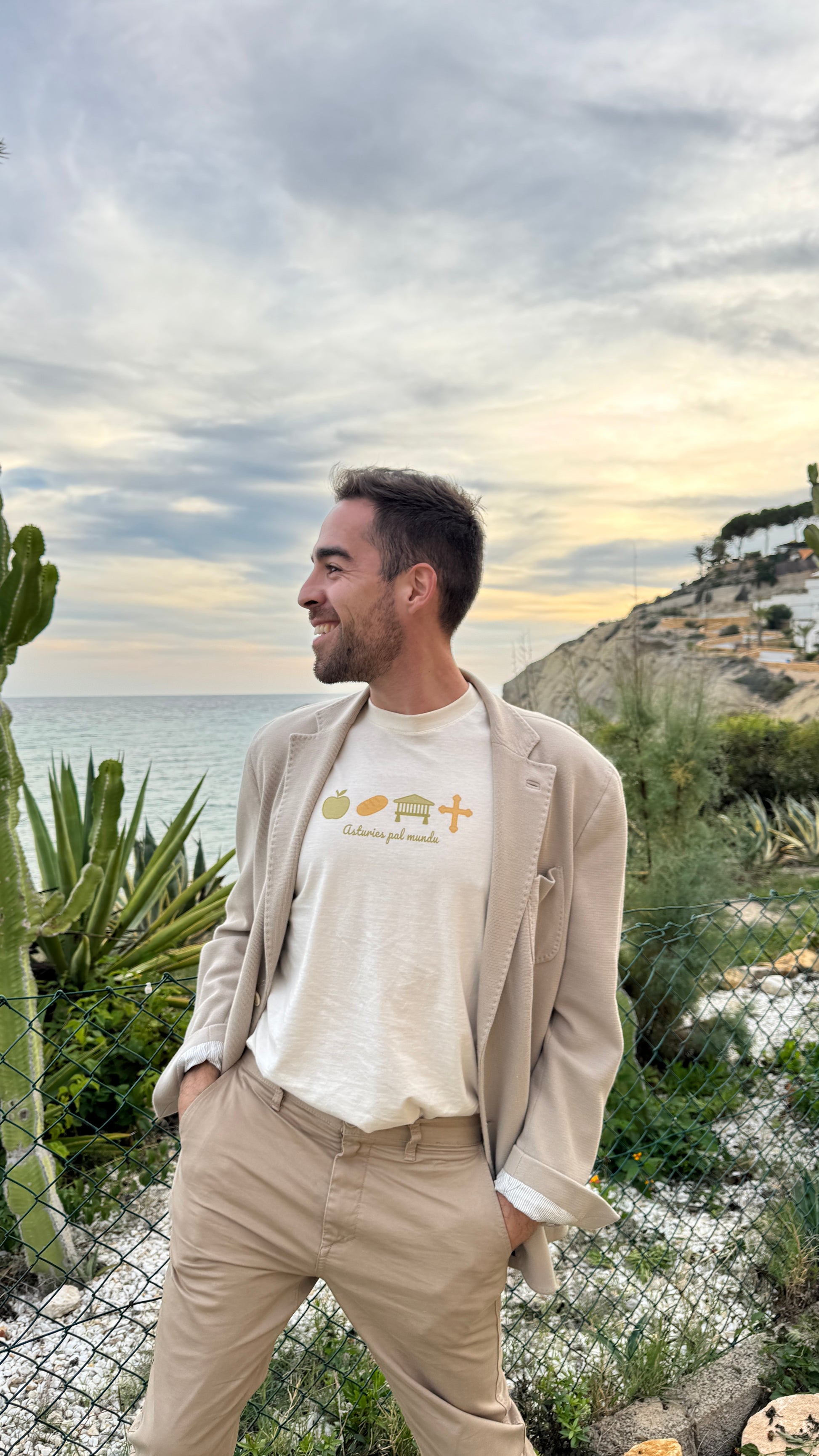 Esta camiseta tiene cuadro de los símbolos que todo asturiano querría tener en los iconos de WhatsApp: manzana, bollu preñao, horreo y Cruz de la Victoria. Estilo minimalista, porque a buen entendedor, pocas palabras bastan.