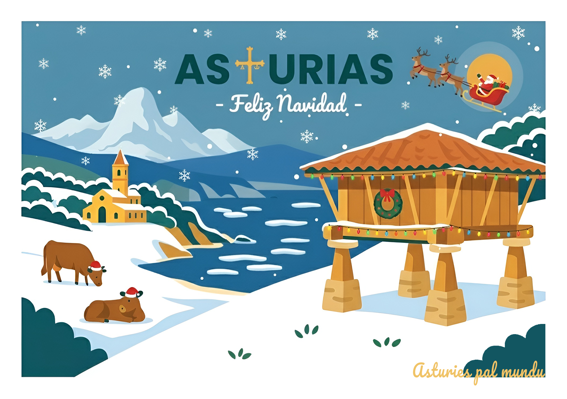 La esencia de Asturies, con ese toque navideño: un hórreo tradicional, vaques pastando, montañinas al fondo (no puede faltar el Urriellu), costa y una iglesia románica.